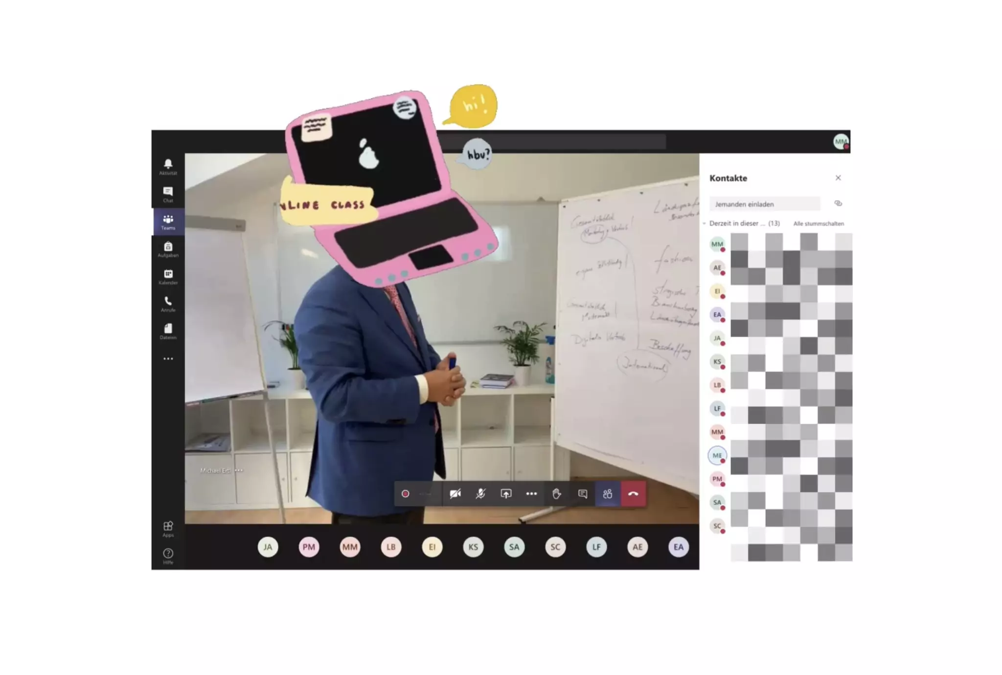 Der Dozent hat sozusagen eine ganze Kulisse mit Flipchart, Tafeln etc. aufgebaut und war fast in Ganzkörperaufnahme in Teams zu sehen. Das erzeugt schon ein bisschen Seminarraumfeeling.