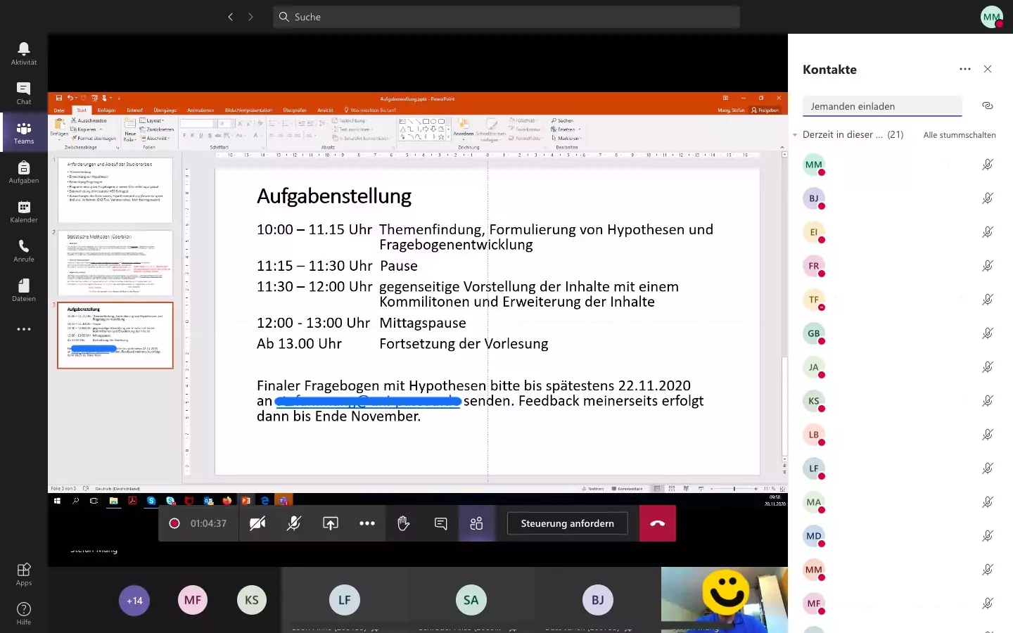 Freitag hatten wir dann Forschungsmethoden und angewandte Statistik. Dort wiederholte der Dozent noch einmal den Stoff von der letzten Präsenz und gab uns weiteren theoretischen Input.